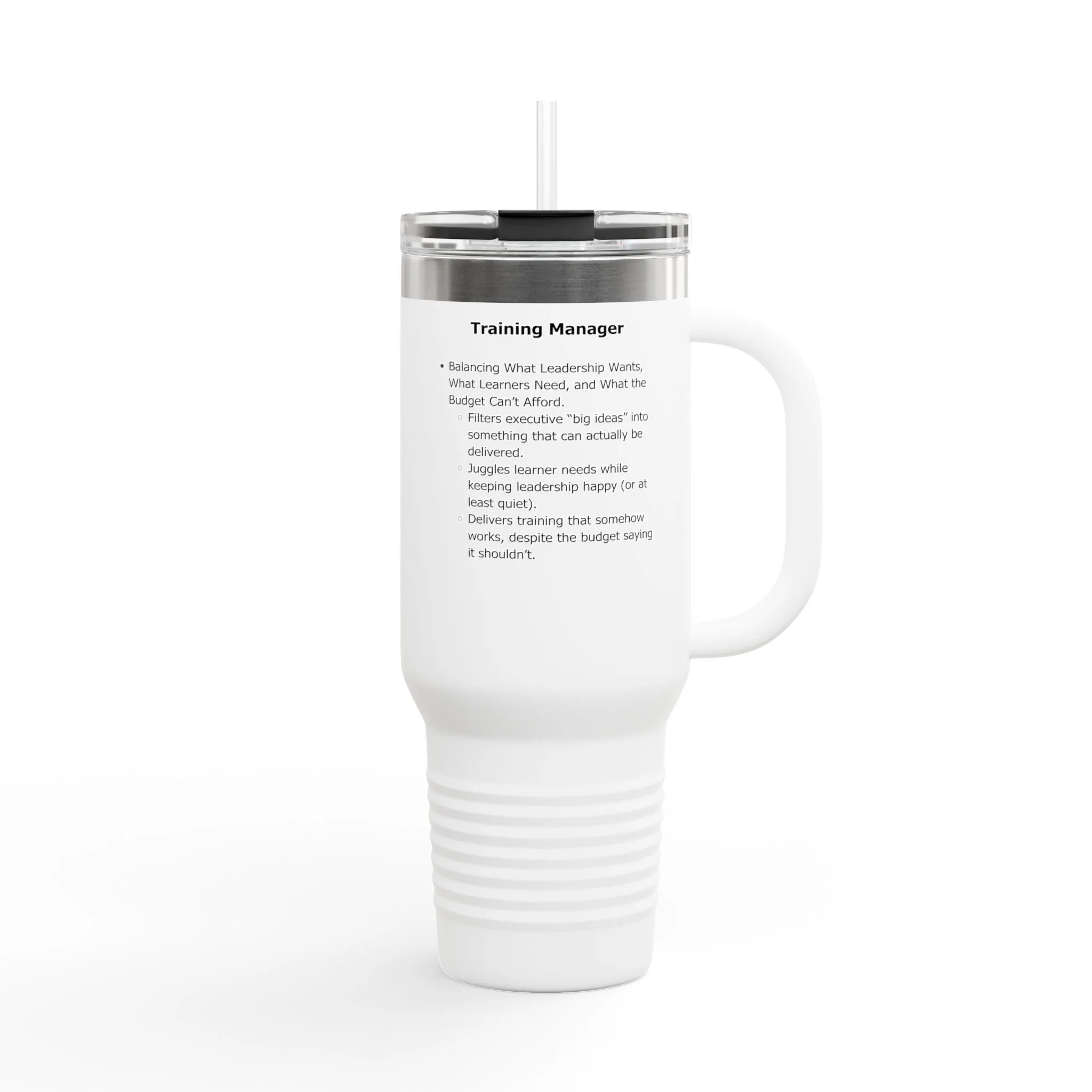 Stay fueled through strategy decks, budget battles, and explaining (again) why training won’t solve everything with this oversized 40oz insulated travel mug featuring the parody job description for a Training Manager. Designed to keep your coffee hot (or your cold brew cold), it’s built for long days of reports, meetings, and steering the chaos no one else wants to touch. Durable, leak-proof, and unapologetically sarcastic, this mug is a survival tool disguised as drinkware.