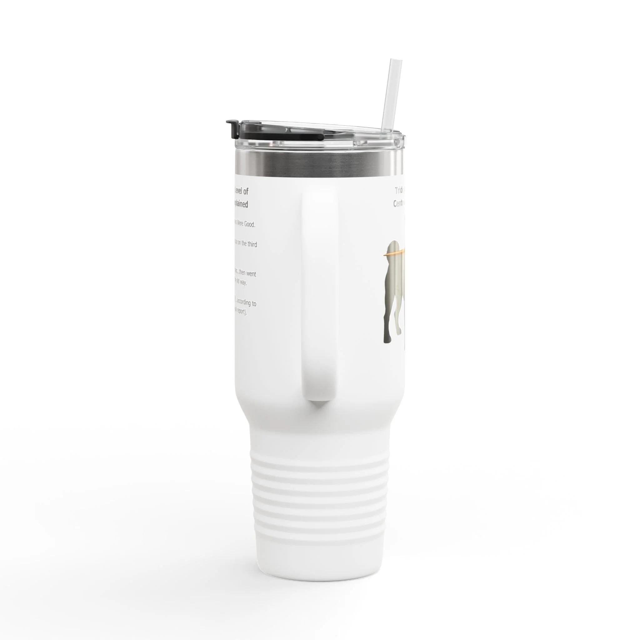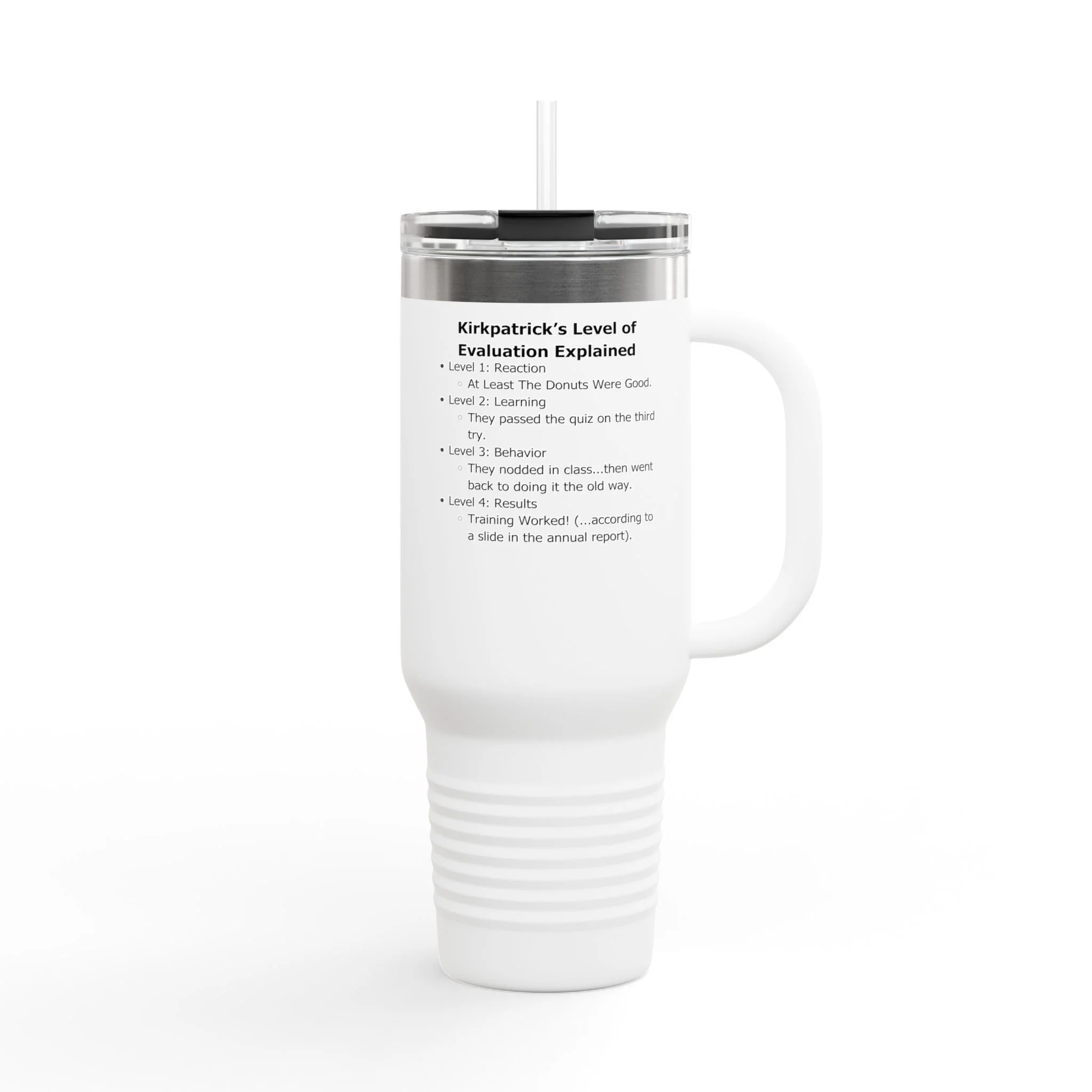 Keep your caffeine strong while you evaluate stronger with this oversized 40oz insulated travel mug featuring the parody description of Kirkpatrick’s Four Levels of Evaluation. Built for training pros who live between “learners liked it” and “show me the ROI,” this mug keeps drinks hot or cold through every reaction survey, quiz, behavior metric, and results report. Durable, leak-proof, and unapologetically sarcastic, it’s the perfect sidekick for conferences, workshops, or your next round of data no one will read.