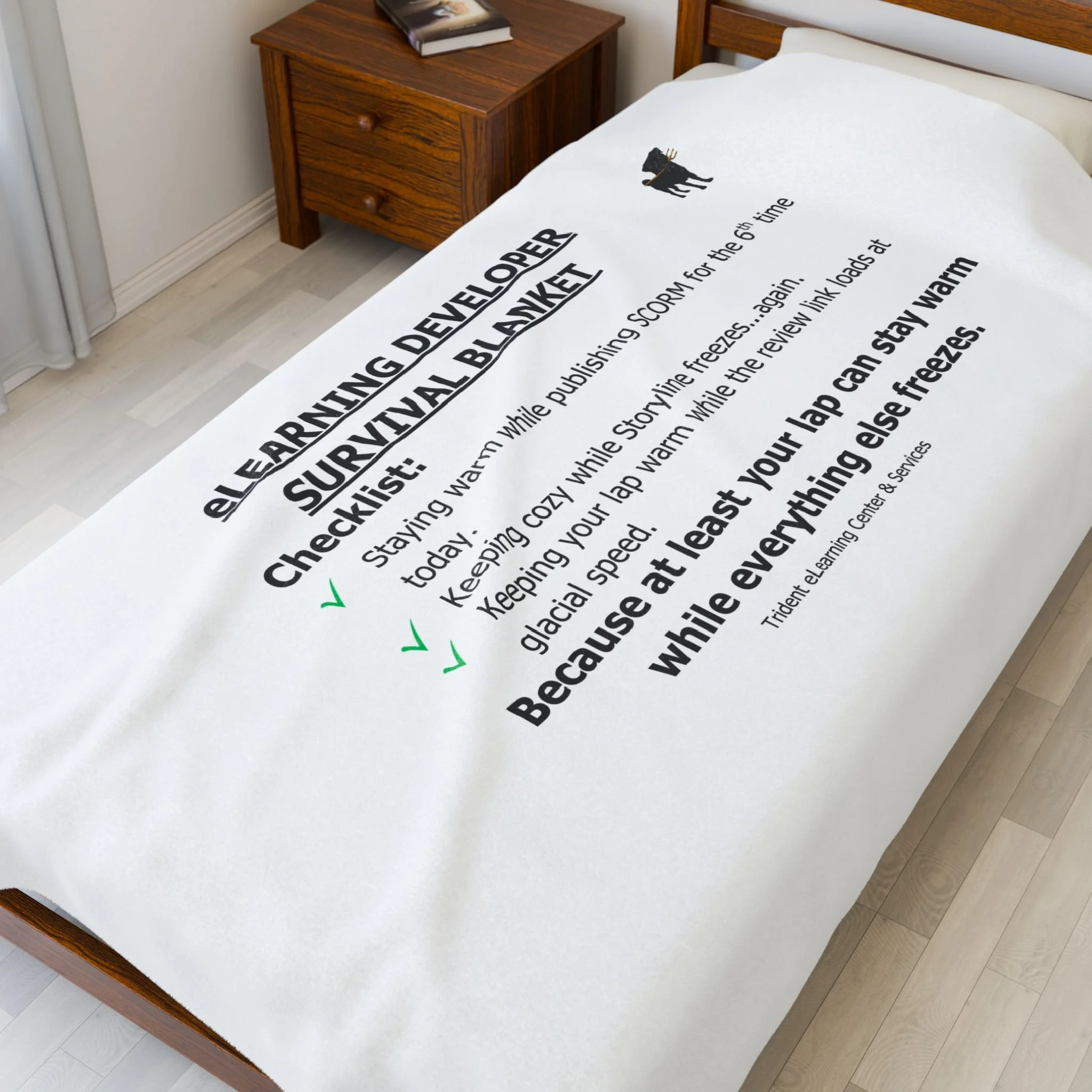 Introducing the ultimate Velveteen Plush Blanket — reimagined for cold cubicles and training offices. Soft, cozy, and hilariously on-point, the Cozy eLearning Developer Throw Blanket: Cold Office Relief brings warmth where the HVAC never will. Featuring a sarcastic “Checklist” and tagline that capture the daily grind of building courses, this blanket is the only deliverable that won’t crash mid-publish.
